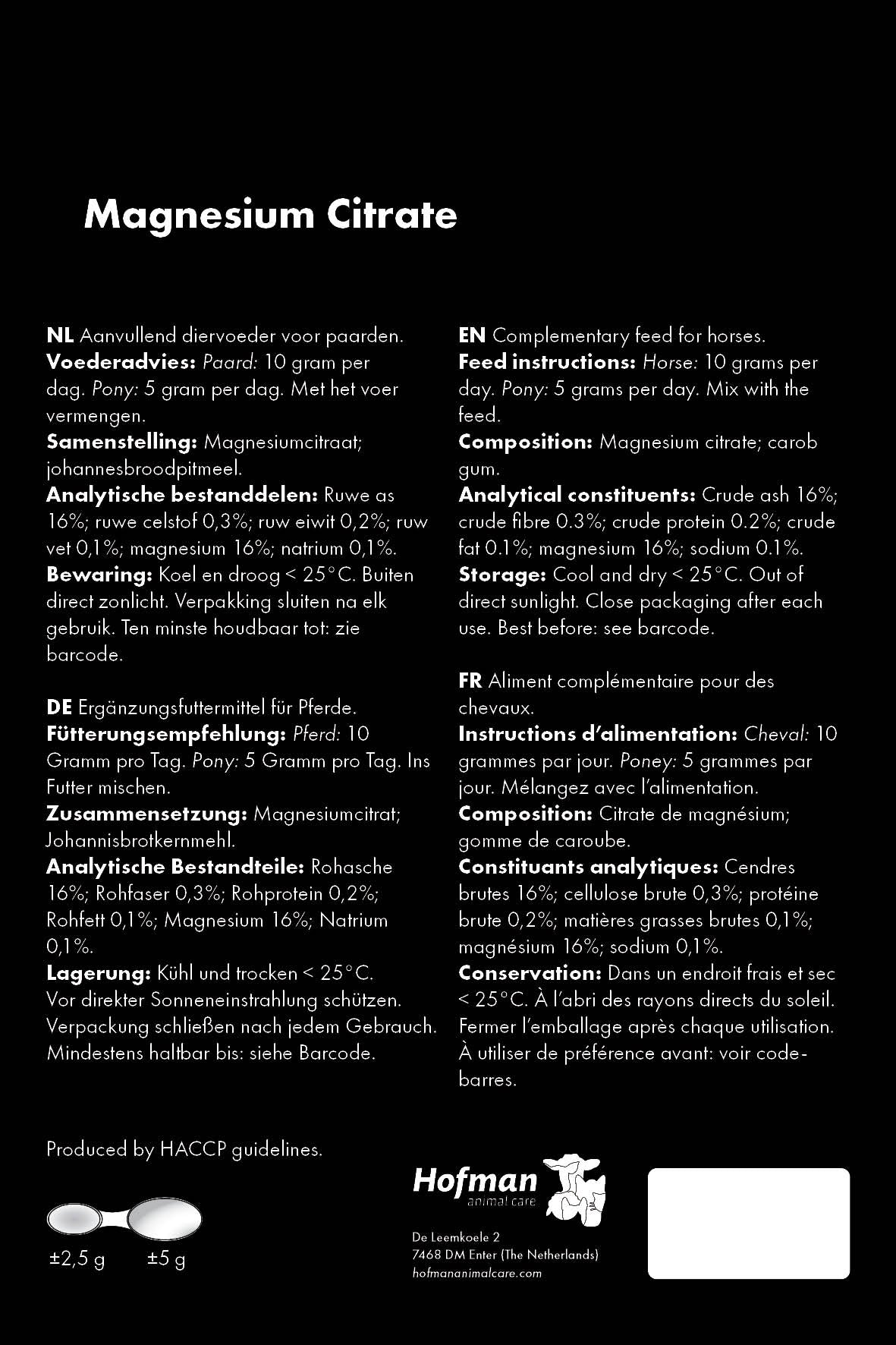 Magnesium is nodig voor de opname van calcium in de botten en voorkomt ophoping van calcium in andere weefsels. Magnesium is met name goed voor wedstrijdpaarden die last hebben van spanning.