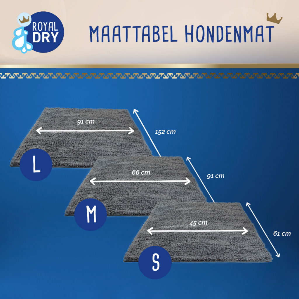De producten van Royal Dry zijn ontwikkeld om je hond als een koning of koningin te behandelen, nadat ze nat of modderig zijn geworden. Het doel is een blije hond en een schoon huis! De Royal Dry producten zijn gemaakt van microvezel chenille, een heerlijk zacht en pluizig garen. Door de vele lusjes, die gemaakt zijn van miljoenen ultrafijne draden, is het oppervlak vele malen groter dan dat van een gladde stof. Hierdoor kunnen de Royal Dry producten maar liefst 7x hun eigen gewicht in vocht opnemen en vasthouden! Perfect om te gebruiken na een bos- of strandwandeling, na het wassen of gewoon op een regenachtige dag. Of je nu je hond droog wil maken, warm wil houden of je huis of auto schoon wil houden, bij Royal Dry vind je het juiste product!