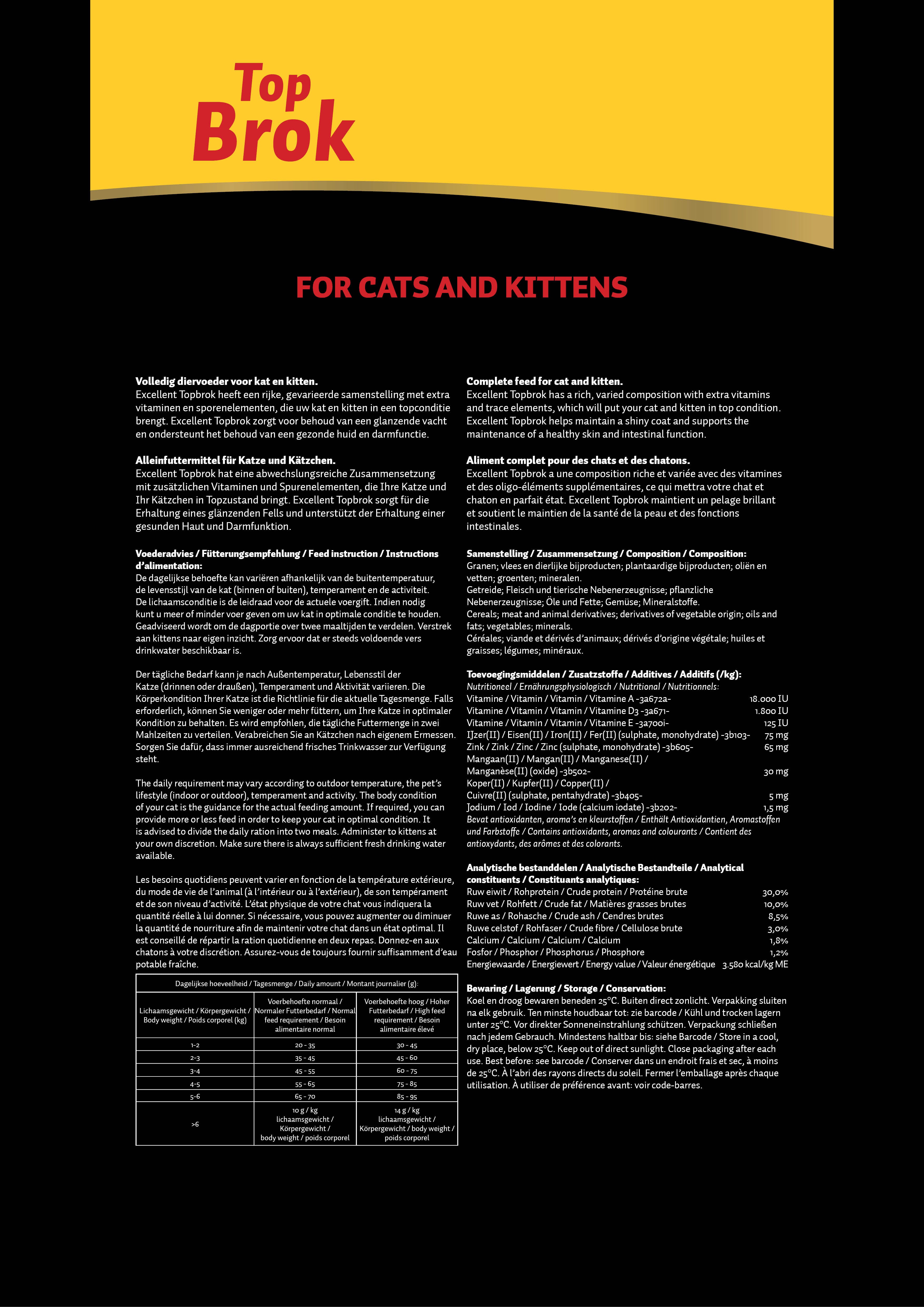 Excellent Topbrok is een gevarieerde voeding en beschikt over een rijke samenstelling aan vitaminen en sporenelementen die je kat en/of kitten in een uitstekende conditie brengt en houdt.