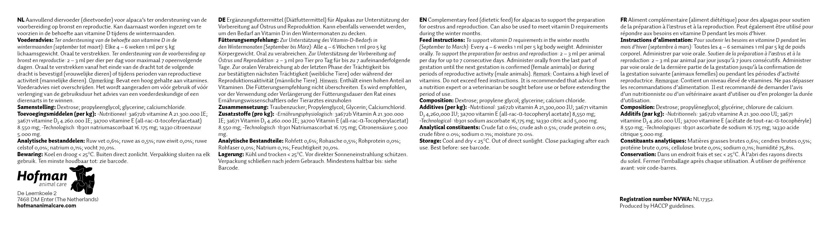 Aanvullend diervoeder (dieetvoeder) voor alpaca’s ter ondersteuning van de voorbereiding op bronst en reproductie.