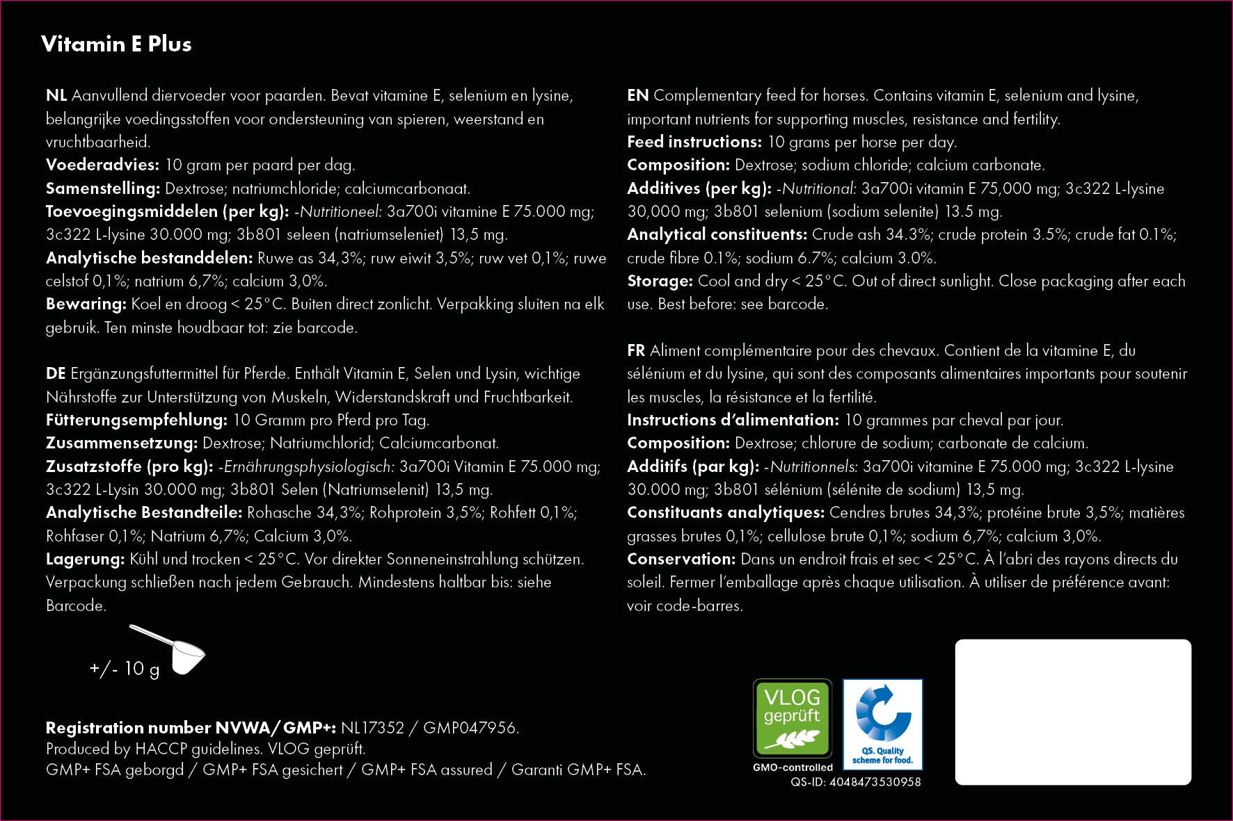 Vitamine E Plus is een uitgebalanceerde plus voeding met vitamine E, lysine en selenium. Dit zijn belangrijke voedingsstoffen voor de ondersteuning van spieren, weerstand en vruchtbaarheid.
