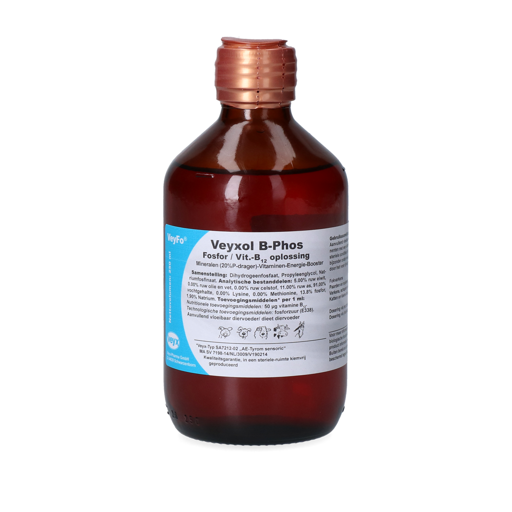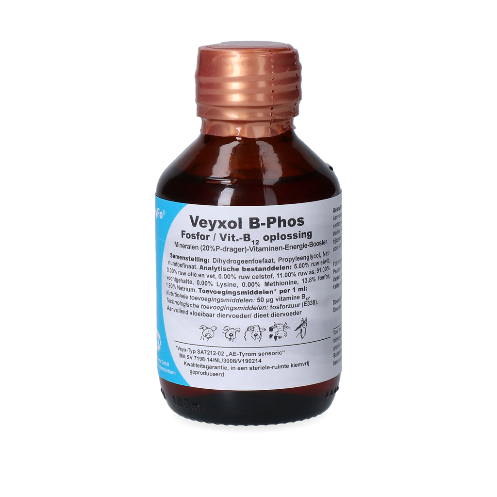 Veyxol B-Phos is een aanvullend diervoeder voor melkkoeien. Ook is het in te zetten als een op de behoeften afgestemde aanvulling van het dagrantsoen van andere diersoorten, zoals varkens, honden en kleine knaagdieren. Bevat ingrediënten met een uitstekende biologische beschikbaarheid en is geproduceerd onder steriele condities (kiemvrij).