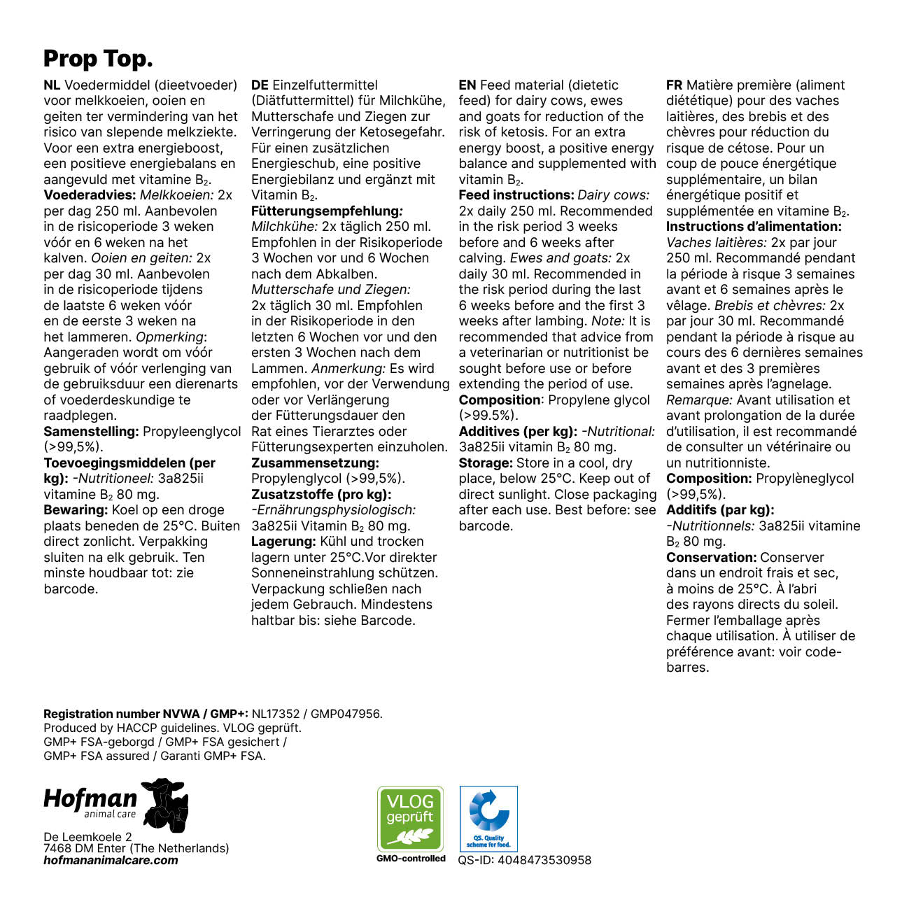 Ter vermindering van het risico van slepende melkziekte. Als extra energiebooster bij melkgevend rundvee. Voor het tegengaan van een negatieve energiebalans bij melkvee. Kan ook ingezet worden bij schapen en geiten. Aanbevolen te gebruiken in de risicoperiode 3 weken vóór en 6 weken na het kalven / 6 weken vóór tot 3 weken na lammeren.