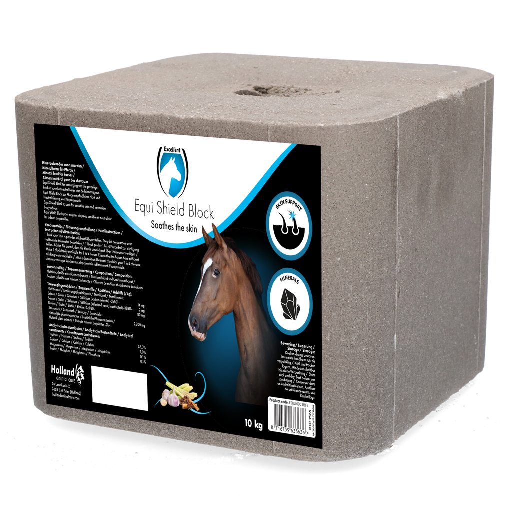 Equi Shield Block is een zoutlikblok voor paarden ter verzorging van de gevoelige huid en het neutraliseren van de lichaamsgeur.