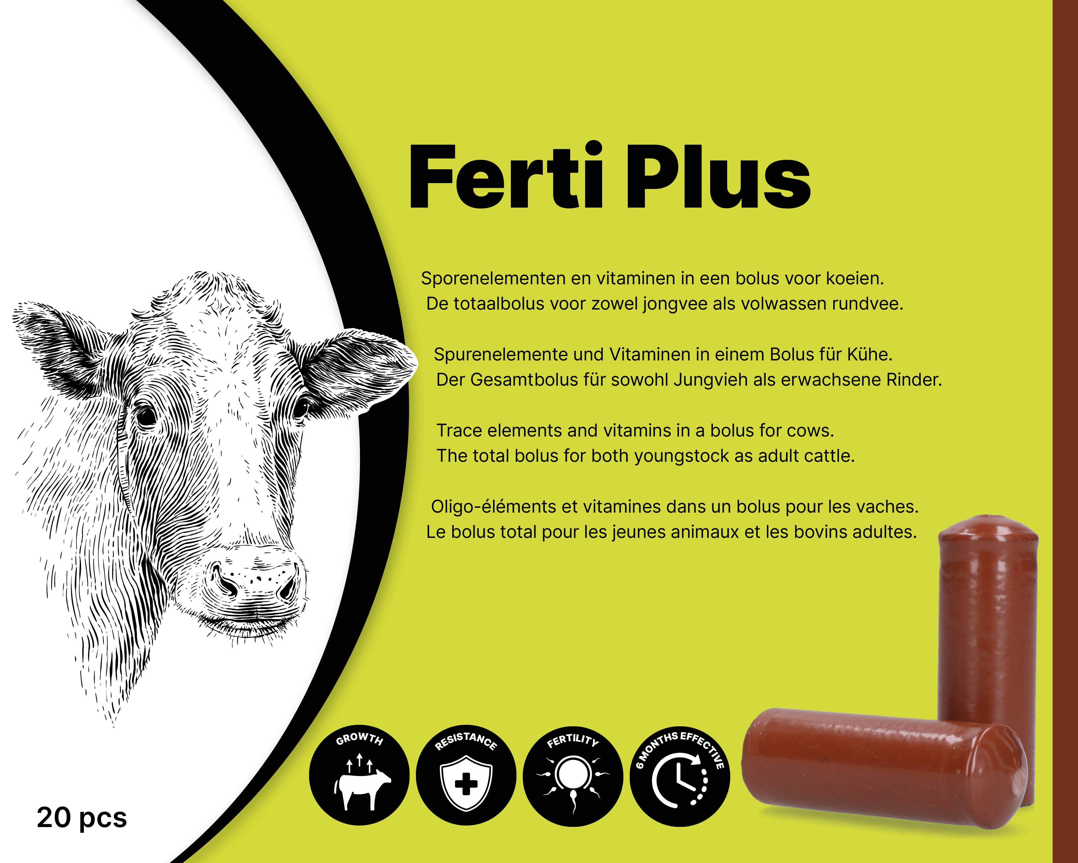 De Ferti Plus bolus is een revolutionaire mineralenformule voor rundvee, die zowel bij jongvee als volwassen rundvee toepasbaar is. Met een werkingsduur van 6 maanden, is deze bolus een efficiënte en kosteneffectieve manier om de groei, vruchtbaarheid en gezondheid van uw vee te ondersteunen.