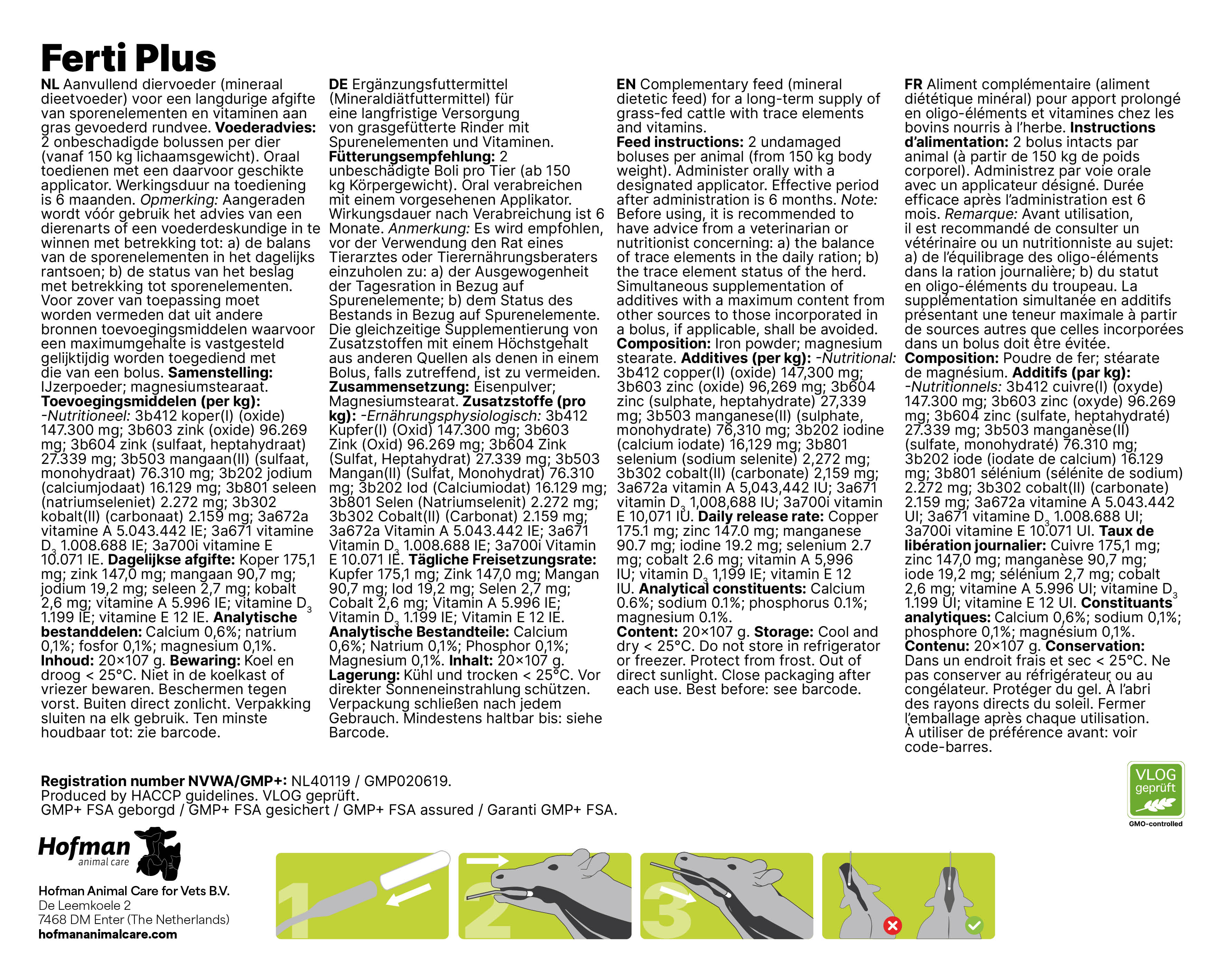 Het is aan te bevelen om aan jongvee 2 Ferti Plus bolussen toe te dienen bij het uitweiden en 2 bolussen bij het opstallen.