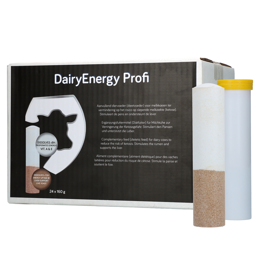 De DairyEnergy Bolus is een bolus met een snelwerkend deel met goed beschikbare glucogene energiebronnen (propionaten) en een langwerkend deel met o.a. levende gist, plantenextracten, vitaminen, sporenelementen en aminozuren ter ondersteuning van de leverfunctie en stimulering van de pensactiviteit. Hiermee biedt het een meervoudige ondersteuning ter vermindering van het risico op slepende melkziekte (ketose).