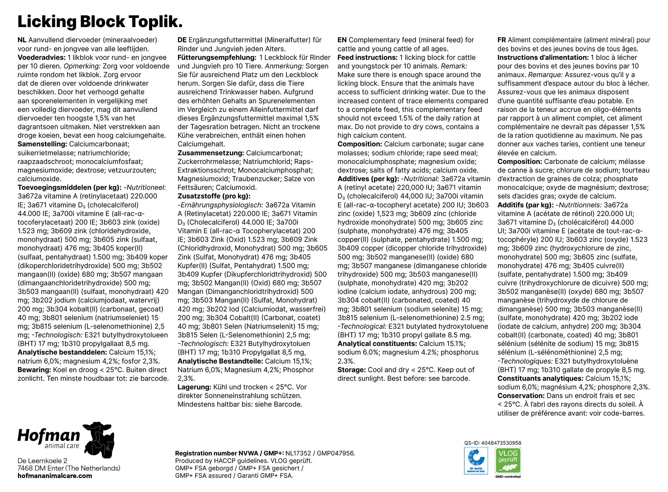 Aanvullend diervoeder (mineraalvoeder) voor rund- en jongvee. Likblok ter aanvulling van mineralen, vitaminen en energie.