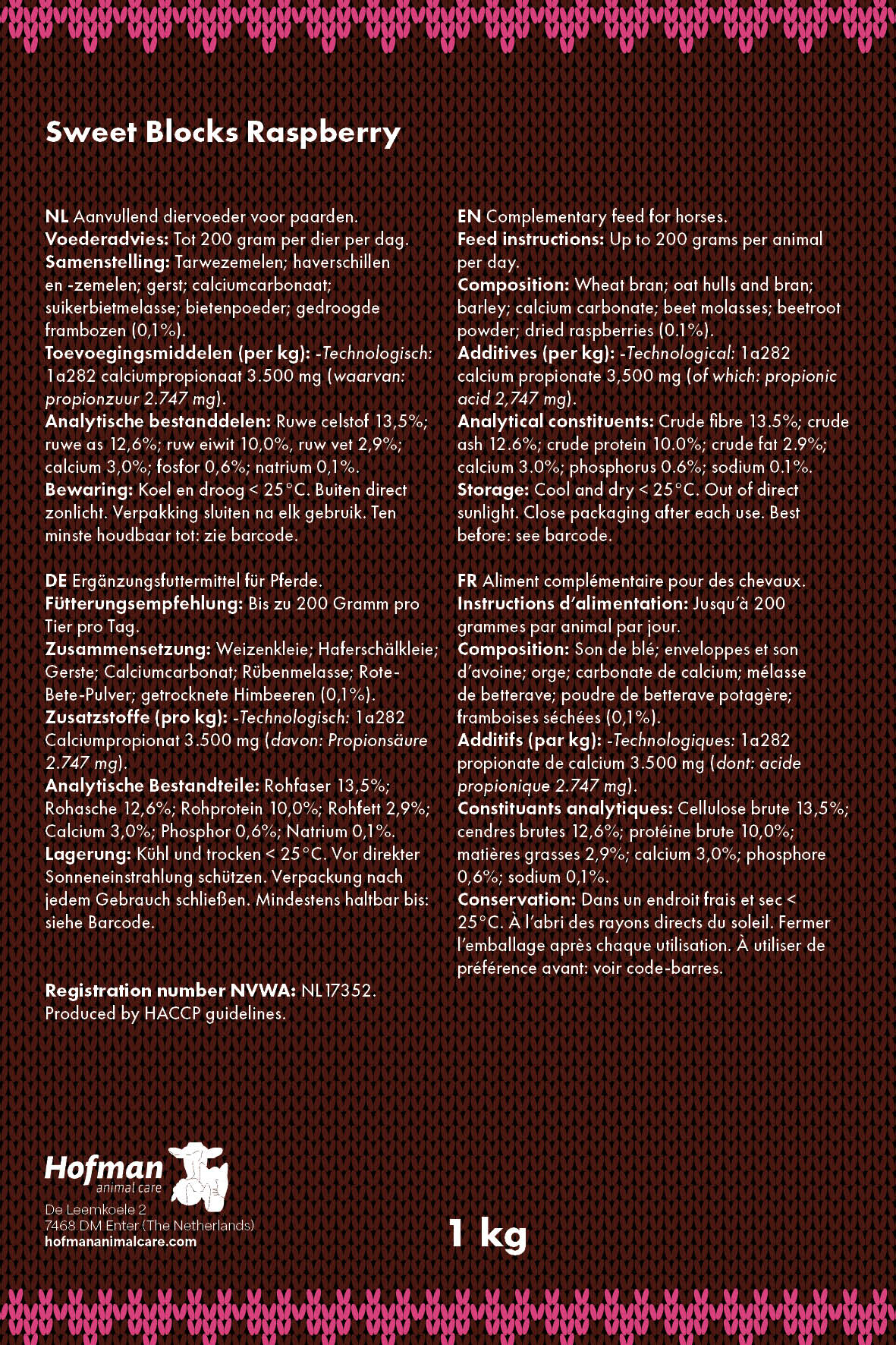 De basis van de Sweet Blocks bestaat uit tarwezemelen, haverschillen en gerst, granen die veel in paardenvoeding worden gebruikt. Daarnaast bevatten deze traktaties suikerbietenmelasse en gedroogde framboos voor een onweerstaanbare smaak.