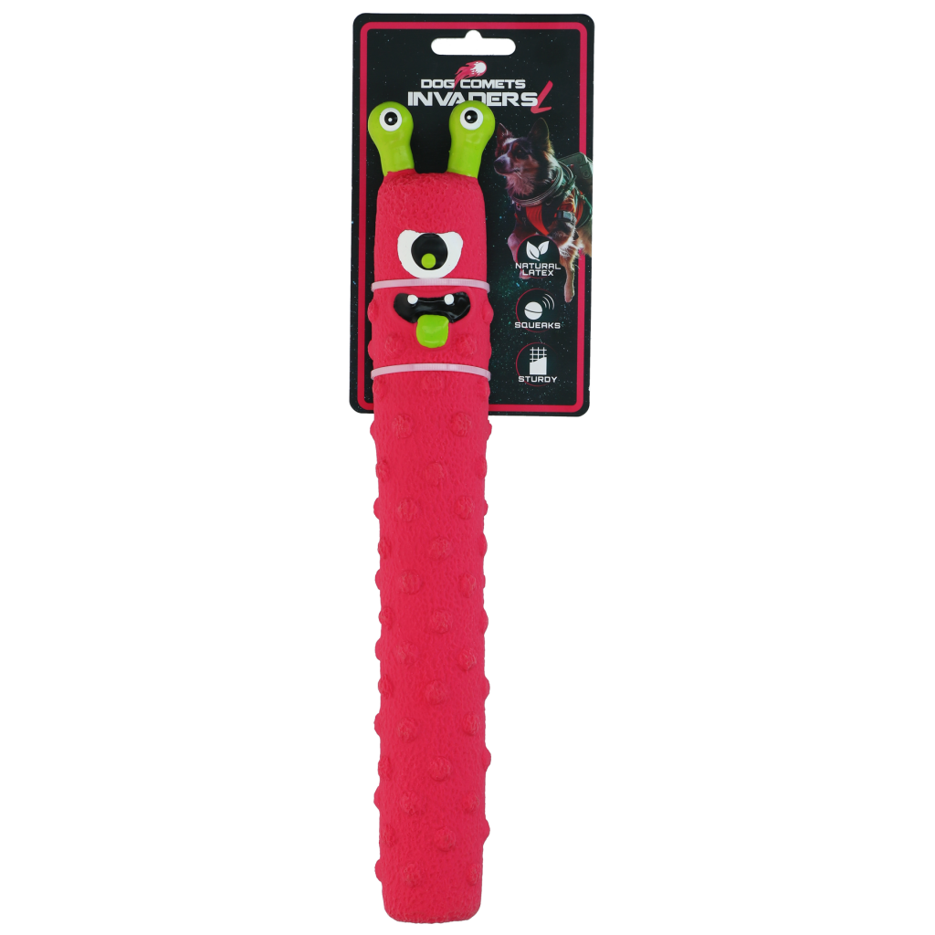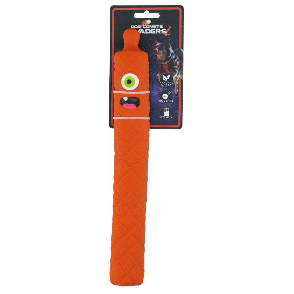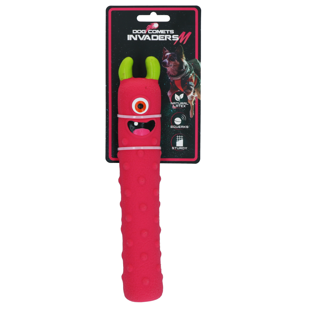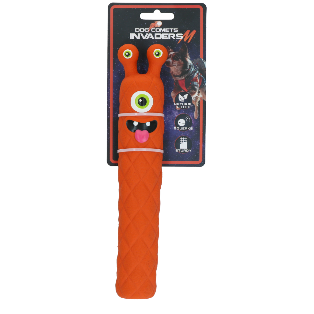 De Dog Comets Invaders Latex zijn buitenaardse indringers die klaarstaan voor avontuur met je hond. Het speeltje is gemaakt van extra dik natuurlijk latex en zorgt voor extra duurzaamheid en langer speelplezier. De ingebouwde pieper maakt het spel nog leuker en houdt honden geboeid tijdens apporteren, gooien of gewoon een actief spelmoment.