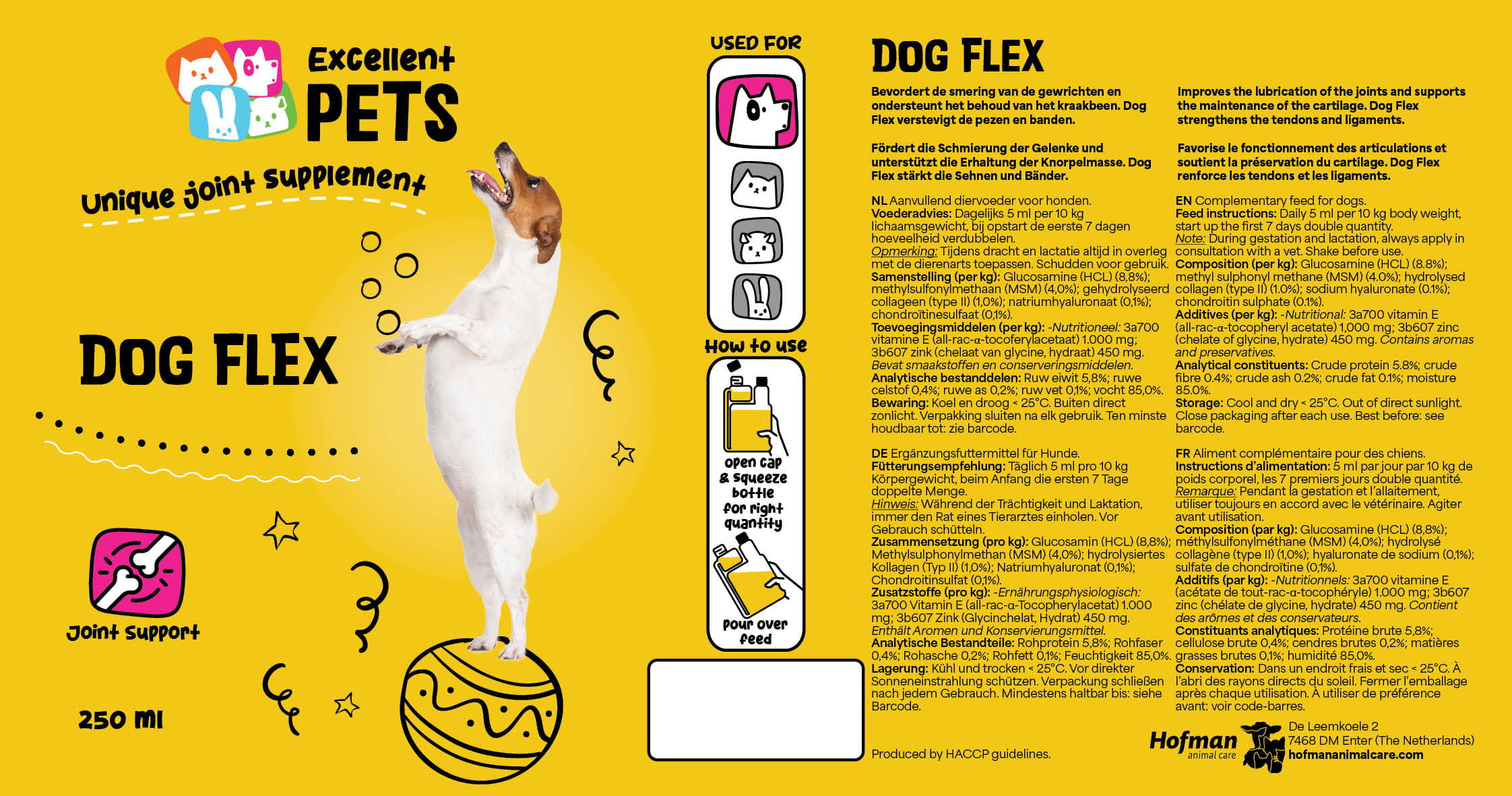 Excellent Pets Dog Flex is een aanvullend diervoeder voor honden in vloeibare vorm. Het draagt bij aan soepele gewrichten en aan stevige botten, pezen en banden.
