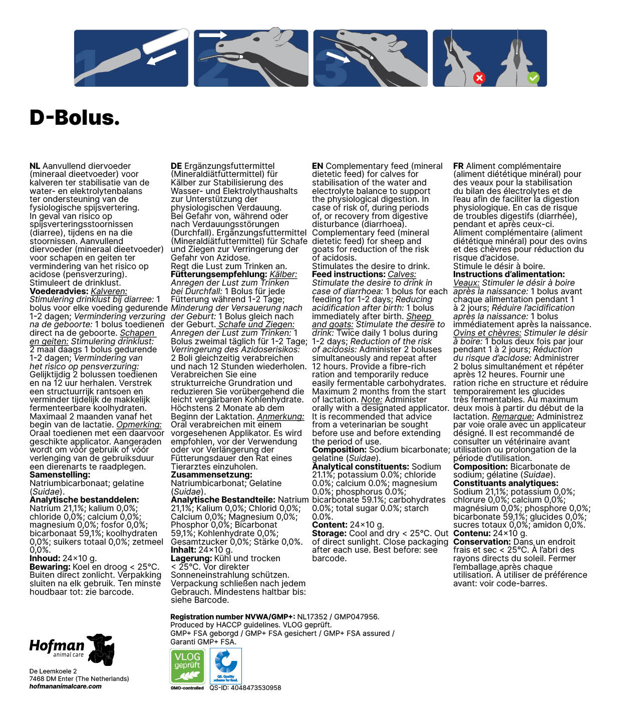 De D-Bolus is een bicarbonaat pil die wordt gebruikt als aanvullend diervoeder voor kalveren. Het is speciaal ontwikkeld als dieetvoeder om de water- en elektrolytenbalans in het lichaam van het kalf te stabiliseren en de fysiologische spijsvertering te ondersteunen. Dit is belangrijk omdat een goede balans van deze stoffen essentieel is voor de gezondheid van het kalf.